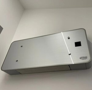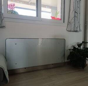 Ventilconvettore Ginevra con pannello frontale in vetro e finitura grigio effetto alluminio spazzolato.